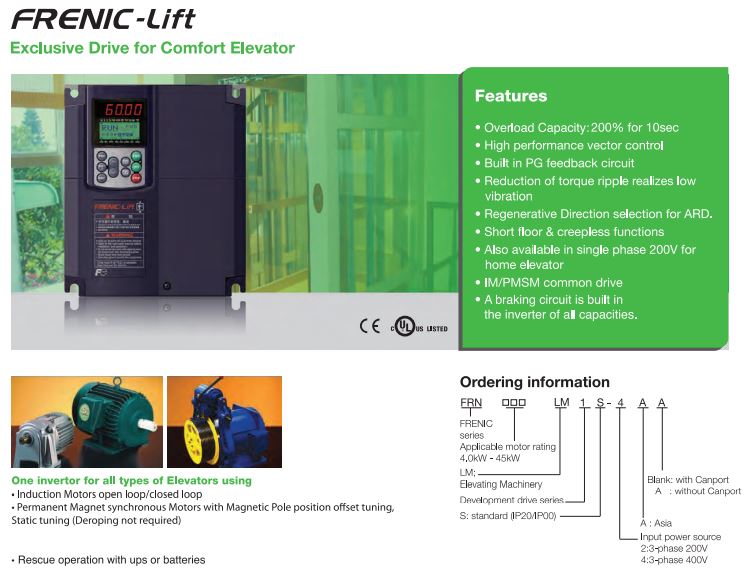 Elevator Inverter (Frenic Mini Lift)-Power Supply Volatage:3Phase, 400VAC, Applicable Standard Motor-7.5kW, Rated Outout Current:18A