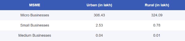About 99% of the Micro-enterprises, making up of the total MSMEs, account for a significant 630.5 lakh enterprises, showcasing the prevalence of small-scale businesses. Small businesses, numbering 3.3 lakh, constitute 0.5% of all MSMEs, while medium businesses, a smaller segment at 0.05 lakh, contribute 0.01%.
