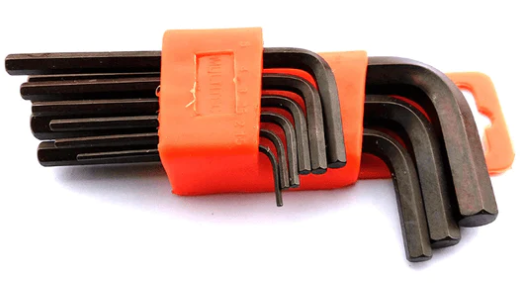 An L-shaped tool called an allen key is used to install and remove fasteners that have hexagonal heads. They are made of a single piece of material that has been bent into a right angle, usually a piece of metal. A hexagonal Allen key has both hexagonal ends.